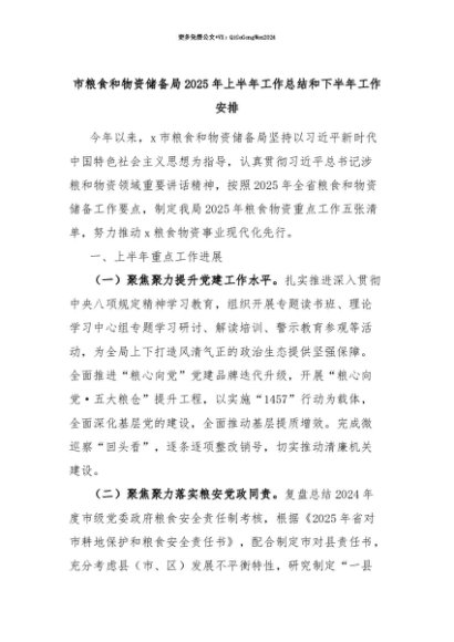 【七哥公文】2025年:【七哥公文】市粮食和物资储备局2025年上半年工作总结和下半年工作安排+更多免费公文+VX:QiGeGongWen2024+更多免费公文+VX:QiGeGongWen2024