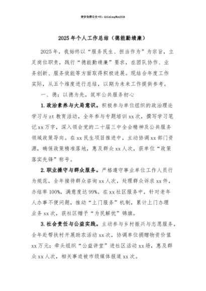 【七哥公文】2025年:【七哥公文】2025年个人工作总结(德能勤绩廉)+更多免费公文+VX:QiGeGongWen2024+更多免费公文+VX:QiGeGongWen2024