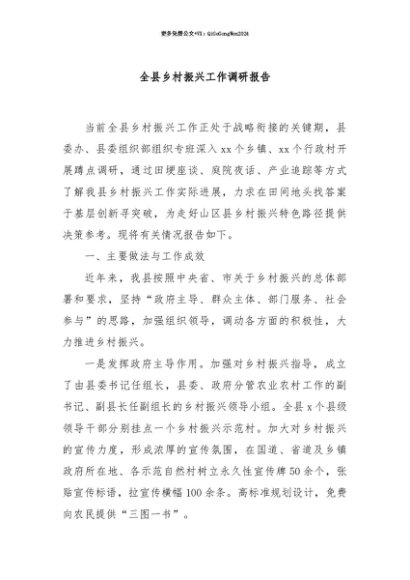 【七哥公文】2025年:【七哥公文】全县乡村振兴工作调研报告+更多免费公文+VX:QiGeGongWen2024+更多免费公文+VX:QiGeGongWen2024