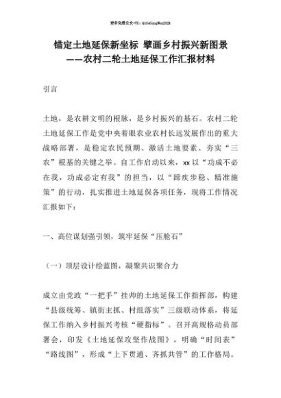 【七哥公文】2025年:【七哥公文】锚定土地延保新坐标 擘画乡村振兴新图景——农村二轮土地延保工作汇报材料+更多免费公文+VX:QiGeGongWen2024+更多免费公文+VX:QiGeGongWen2024