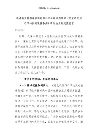 【七哥公文】2025年:【七哥公文】税务局主要领导在理论学习中心组专题学习《党政机关厉行节约反对浪费条例》研讨会上的交流发言+更多免费公文+VX:QiGeGongWen2024+更多免费公文+VX:QiGeGongWen2024
