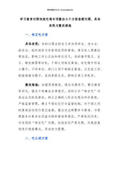 【七哥公文】2025年:【七哥公文】学习教育对照违规吃喝专项整治七个方面查摆问题、具体表现与整改措施+更多免费公文+VX:QiGeGongWen2024+更多免费公文+VX:QiGeGongWen2024