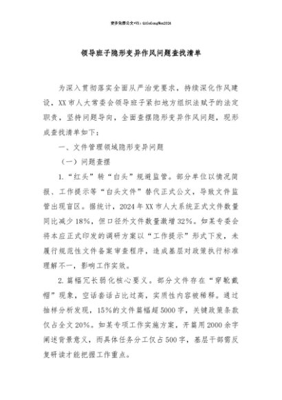 【七哥公文】2025年:【七哥公文】领导班子隐形变异作风问题查找清单+更多免费公文+VX:QiGeGongWen2024+更多免费公文+VX:QiGeGongWen2024