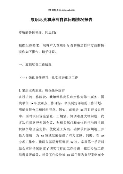 【七哥公文】2025年:【七哥公文】履职尽责和廉洁自律问题情况报告+更多免费公文+VX:QiGeGongWen2024+更多免费公文+VX:QiGeGongWen2024