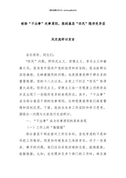【七哥公文】2025年:【七哥公文】破除“不出事”处事原则,狠刹基层“四风”隐形变异歪风交流研讨发言+更多免费公文+VX:QiGeGongWen2024+更多免费公文+VX:QiGeGongWen2024