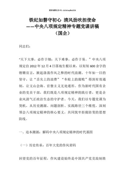 【七哥公文】2025年:【七哥公文】铁纪如磐守初心 清风劲吹担使命——中央八项规定精神专题党课讲稿(国企)+更多免费公文+VX:QiGeGongWen2024+更多免费公文+VX:QiGeGongWen2024