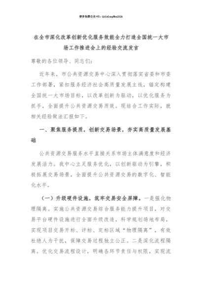 【七哥公文】2025年:【七哥公文】在全市深化改革创新优化服务效能全力打造全国统一大市场工作推进会上的经验交流发言+更多免费公文+VX:QiGeGongWen2024+更多免费公文+VX:QiGeGongWen2024