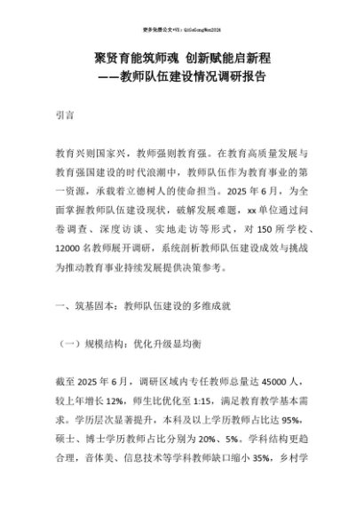 【七哥公文】2025年:【七哥公文】聚贤育能筑师魂 创新赋能启新程——教师队伍建设情况调研报告+更多免费公文+VX:QiGeGongWen2024+更多免费公文+VX:QiGeGongWen2024
