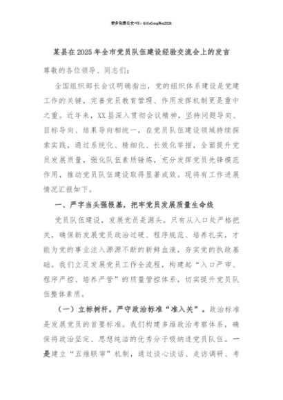 【七哥公文】2025年:【七哥公文】某县在2025年全市党员队伍建设经验交流会上的发言+更多免费公文+VX:QiGeGongWen2024+更多免费公文+VX:QiGeGongWen2024