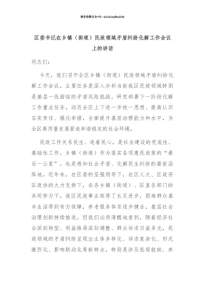 【七哥公文】2025年:【七哥公文】区委书记在乡镇(街道)民政领域矛盾纠纷化解工作会议上的讲话+更多免费公文+VX:QiGeGongWen2024+更多免费公文+VX:QiGeGongWen2024
