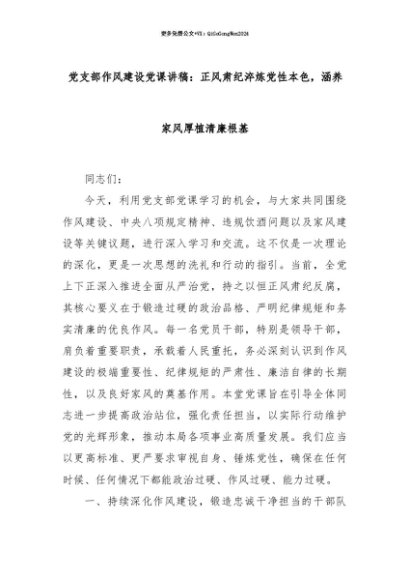 【七哥公文】2025年:【七哥公文】党支部作风建设党课讲稿:正风肃纪淬炼党性本色,涵养家风厚植清廉根基+更多免费公文+VX:QiGeGongWen2024+更多免费公文+VX:QiGeGongWen2024