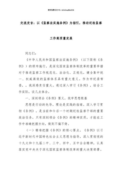 【七哥公文】2025年:【七哥公文】交流发言:以《监察法实施条例》为指引,推动纪检监察工作高质量发展+更多免费公文+VX:QiGeGongWen2024+更多免费公文+VX:QiGeGongWen2024