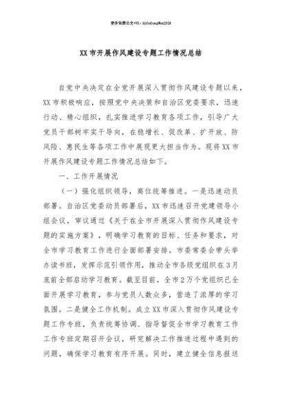 【七哥公文】2025年:【七哥公文】XX市开展作风建设专题工作情况总结+更多免费公文+VX:QiGeGongWen2024+更多免费公文+VX:QiGeGongWen2024