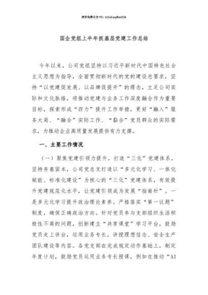 【七哥公文】2025年:【七哥公文】国企党组上半年抓基层党建工作总结+更多免费公文+VX:QiGeGongWen2024+更多免费公文+VX:QiGeGongWen2024
