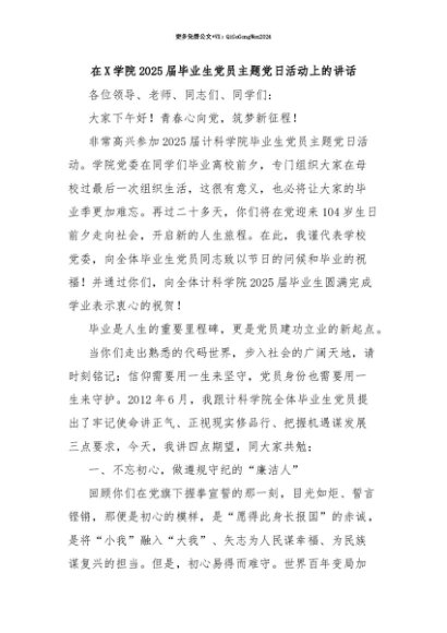 【七哥公文】2025年:【七哥公文】在X学院2025届毕业生党员主题党日活动上的讲话+更多免费公文+VX:QiGeGongWen2024+更多免费公文+VX:QiGeGongWen2024