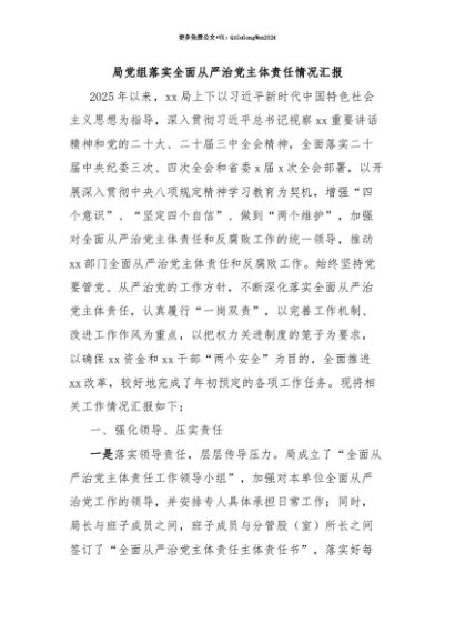 【七哥公文】2025年:【七哥公文】局党组落实全面从严治党主体责任情况汇报+更多免费公文+VX:QiGeGongWen2024+更多免费公文+VX:QiGeGongWen2024