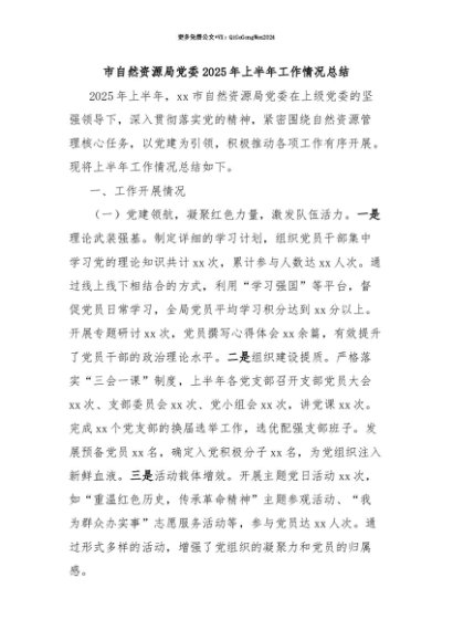 【七哥公文】2025年:【七哥公文】市自然资源局党委2025年上半年工作情况总结+更多免费公文+VX:QiGeGongWen2024+更多免费公文+VX:QiGeGongWen2024