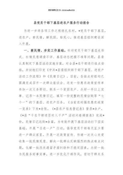 【七哥公文】2025年:【七哥公文】县党员干部下基层进农户服务行动报告+更多免费公文+VX:QiGeGongWen2024+更多免费公文+VX:QiGeGongWen2024