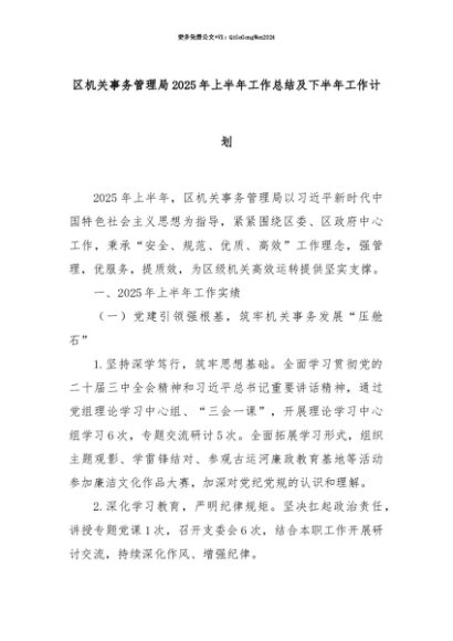 【七哥公文】2025年:【七哥公文】区机关事务管理局2025年上半年工作总结及下半年工作计划+更多免费公文+VX:QiGeGongWen2024+更多免费公文+VX:QiGeGongWen2024