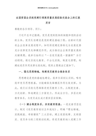 【七哥公文】2025年:【七哥公文】在国资国企系统党建引领高质量发展经验交流会上的汇报发言+更多免费公文+VX:QiGeGongWen2024+更多免费公文+VX:QiGeGongWen2024