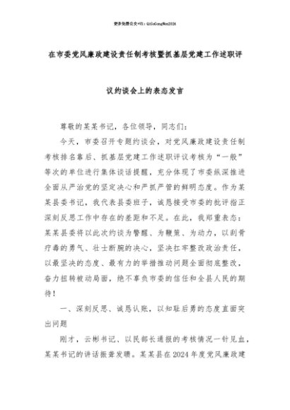 【七哥公文】2025年:【七哥公文】在市委党风廉政建设责任制考核暨抓基层党建工作述职评议约谈会上的表态发言+更多免费公文+VX:QiGeGongWen2024+更多免费公文+VX:QiGeGongWen2024