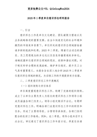 【七哥公文】2025年:【七哥公文】2025年二季度单位意识形态研判报告+更多免费公文+VX:QiGeGongWen2024+更多免费公文+VX:QiGeGongWen2024