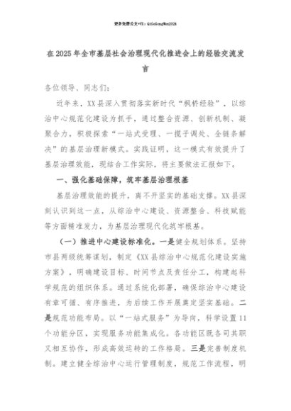 【七哥公文】2025年:【七哥公文】在2025年全市基层社会治理现代化推进会上的经验交流发言+更多免费公文+VX:QiGeGongWen2024+更多免费公文+VX:QiGeGongWen2024