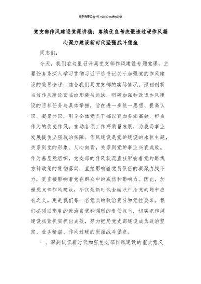 【七哥公文】2025年:【七哥公文】党支部作风建设党课讲稿:赓续优良传统锻造过硬作风凝心聚力建设新时代坚强战斗堡垒+更多免费公文+VX:QiGeGongWen2024+更多免费公文+VX:QiGeGongWen2024