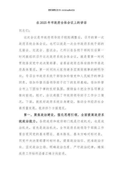 【七哥公文】2025年:【七哥公文】在2025年市政府全体会议上的讲话+更多免费公文+VX:QiGeGongWen2024+更多免费公文+VX:QiGeGongWen2024