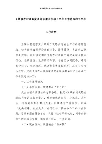 【七哥公文】2025年:【七哥公文】X镇镇农村道路交通综合整治行动上半年工作总结和下半年工作计划+更多免费公文+VX:QiGeGongWen2024+更多免费公文+VX:QiGeGongWen2024