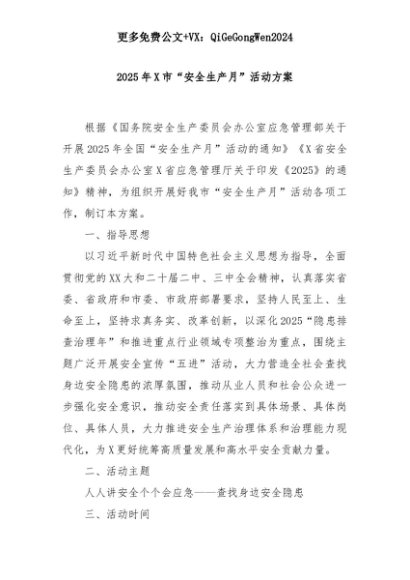 【七哥公文】2025年:【七哥公文】2025年X市“安全生产月”活动方案+更多免费公文+VX:QiGeGongWen2024+更多免费公文+VX:QiGeGongWen2024