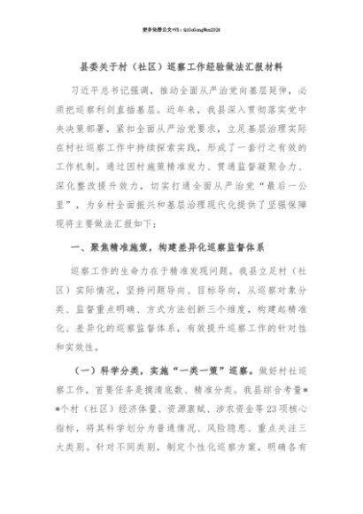 【七哥公文】2025年:【七哥公文】县委关于村(社区)巡察工作经验做法汇报材料+更多免费公文+VX:QiGeGongWen2024+更多免费公文+VX:QiGeGongWen2024