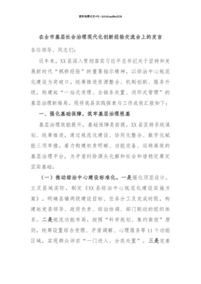 【七哥公文】2025年:【七哥公文】在全市基层社会治理现代化创新经验交流会上的发言+更多免费公文+VX:QiGeGongWen2024+更多免费公文+VX:QiGeGongWen2024