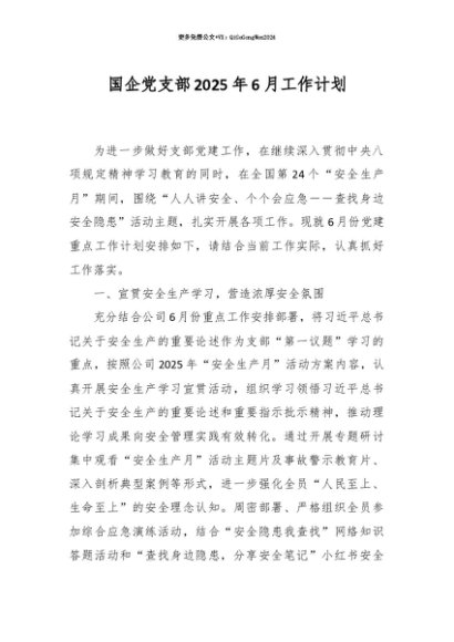 【七哥公文】2025年:【七哥公文】国企党支部2025年6月工作计划+更多免费公文+VX:QiGeGongWen2024+更多免费公文+VX:QiGeGongWen2024
