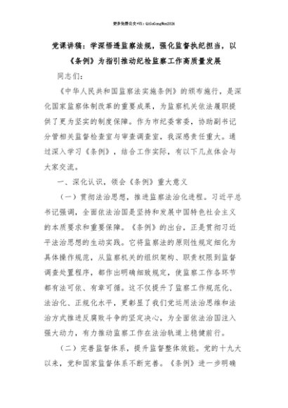 【七哥公文】2025年:【七哥公文】党课讲稿:学深悟透监察法规,强化监督执纪担当,以《条例》为指引推动纪检监察工作高质量发展+更多免费公文+VX:QiGeGongWen2024+更多免费公文+VX:QiGeGongWen2024