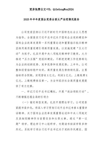 【七哥公文】2025年:【七哥公文】2025年半年度国企党委全面从严治党情况报告+更多免费公文+VX:QiGeGongWen2024+更多免费公文+VX:QiGeGongWen2024