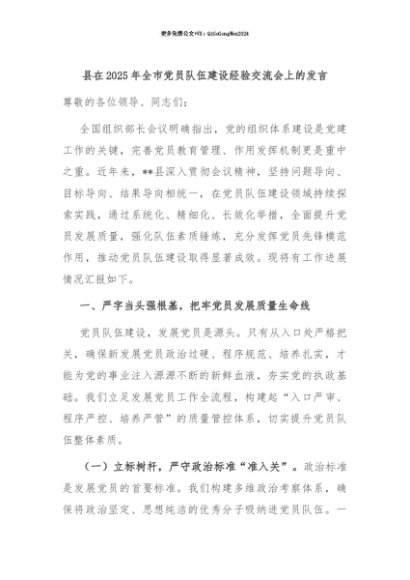 【七哥公文】2025年:【七哥公文】县在2025年全市党员队伍建设经验交流会上的发言+更多免费公文+VX:QiGeGongWen2024+更多免费公文+VX:QiGeGongWen2024