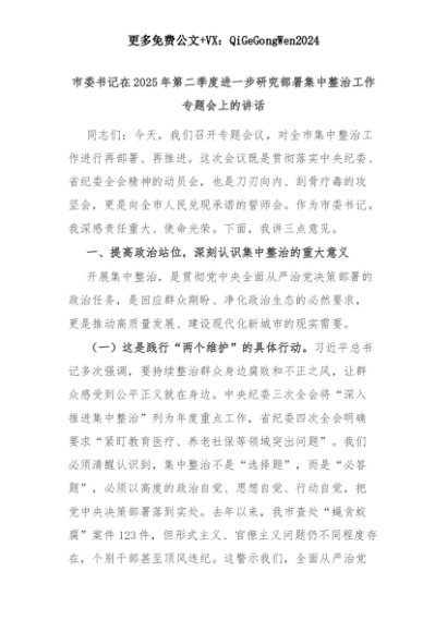 【七哥公文】2025年:【七哥公文】市委书记在2025年第二季度进一步研究部署集中整治工作专题会上的讲话+更多免费公文+VX:QiGeGongWen2024+更多免费公文+VX:QiGeGongWen2024