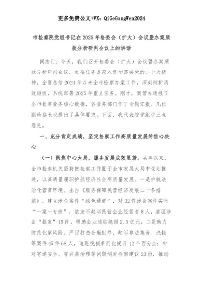 【七哥公文】2025年:【七哥公文】市检察院党组书记在2025年检委会(扩大)会议暨办案质效分析研判会议上的讲话+更多免费公文+VX:QiGeGongWen2024+更多免费公文+VX:QiGeGongWen2024