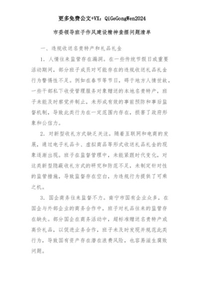 【七哥公文】2025年:【七哥公文】市委领导班子作风建设精神查摆问题清单+更多免费公文+VX:QiGeGongWen2024+更多免费公文+VX:QiGeGongWen2024