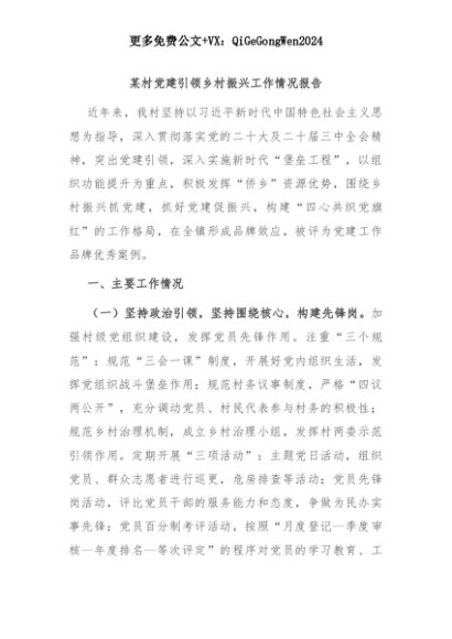 【七哥公文】2025年:【七哥公文】某村党建引领乡村振兴工作情况报告+更多免费公文+VX:QiGeGongWen2024+更多免费公文+VX:QiGeGongWen2024