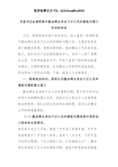 【七哥公文】2025年:【七哥公文】市委书记在调研集中整治群众身边不正之风和腐败问题工作时的讲话+更多免费公文+VX:QiGeGongWen2024+更多免费公文+VX:QiGeGongWen2024