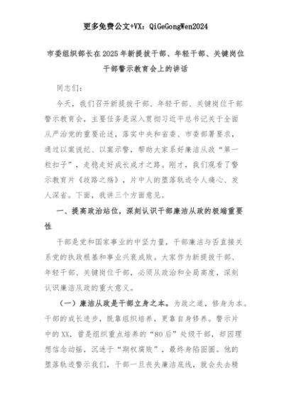 【七哥公文】2025年:【七哥公文】市委组织部长在2025年新提拔干部、年轻干部、关键岗位干部警示教育会上的讲话+更多免费公文+VX:QiGeGongWen2024+更多免费公文+VX:QiGeGongWen2024