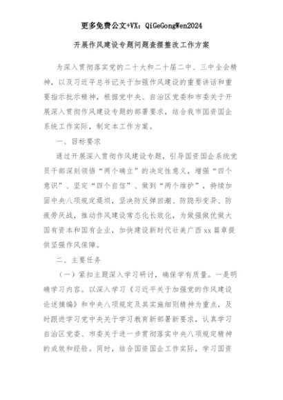 【七哥公文】2025年:【七哥公文】开展作风建设专题问题查摆整改工作方案+更多免费公文+VX:QiGeGongWen2024+更多免费公文+VX:QiGeGongWen2024