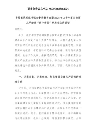 【七哥公文】2025年:【七哥公文】市检察院党组书记在警示教育会暨2025年上半年落实全面从严治党“两个责任”联席会上的讲话+更多免费公文+VX:QiGeGongWen2024+更多免费公文+VX:QiGeGongWen2024