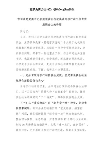 【七哥公文】2025年:【七哥公文】市司法局党委书记在规范涉企行政执法专项行动工作专班座谈会上的讲话+更多免费公文+VX:QiGeGongWen2024+更多免费公文+VX:QiGeGongWen2024