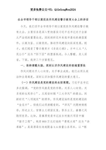 【七哥公文】2025年:【七哥公文】在全市领导干部以案促改作风建设警示教育大会上的讲话+更多免费公文+VX:QiGeGongWen2024+更多免费公文+VX:QiGeGongWen2024