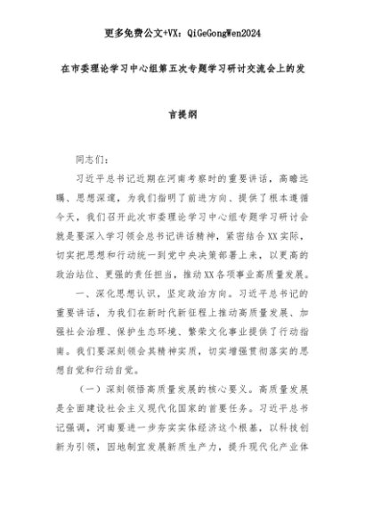 【七哥公文】2025年:【七哥公文】在市委理论学习中心组第五次专题学习研讨交流会上的发言提纲+更多免费公文+VX:QiGeGongWen2024+更多免费公文+VX:QiGeGongWen2024