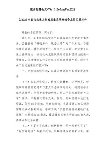 【七哥公文】2025年:【七哥公文】在2025年机关党建工作高质量发展推进会上的汇报材料+更多免费公文+VX:QiGeGongWen2024+更多免费公文+VX:QiGeGongWen2024