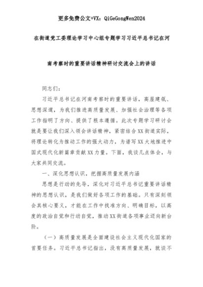 【七哥公文】2025年:【七哥公文】在街道党工委理论学习中心组专题学习习近平总书记在河南考察时的重要讲话精神研讨交流会上的讲话+更多免费公文+VX:QiGeGongWen2024+更多免费公文+VX:QiGeGongWen2024